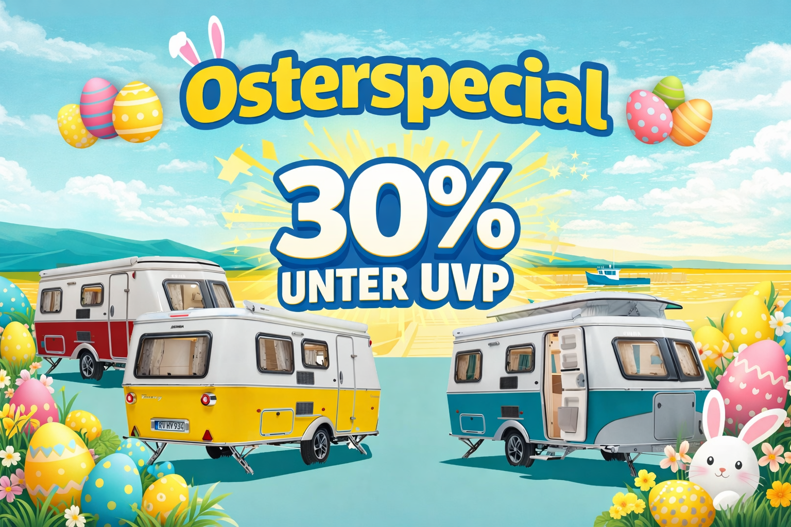 der Osterhase war schon bei uns und hat für euch eine tolle Überraschung hinterlassen. Auf alle vorhanden Eriba Touring Wohnwagen schenkt Ihnen der Osterhase einen Rabatt von 30% auf die unverbindliche Preisempfehlung. Schaut euch unter diesem Link die sofort verfügbaren Modelle an. Ihr findet sie in allen möglichen Größen und Farben. Also schaut schnell rein und sichert euch euer Osterei damit ihr noch in diesem Jahr damit losdüsen könnt.